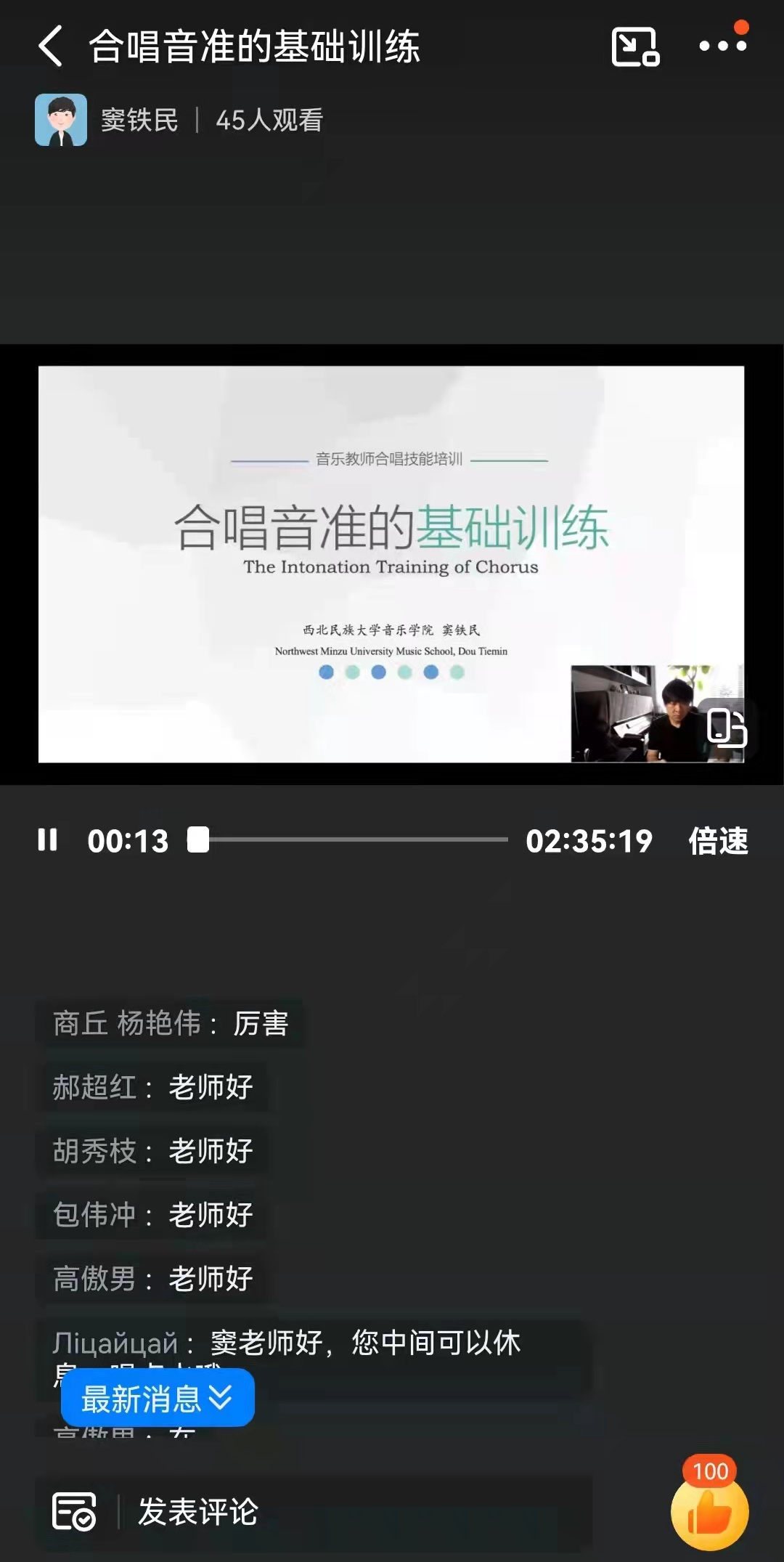 6月3日,应tyc122ccVIP之邀,西北民族大学音乐公司青年指挥家窦铁民为国培计划——县级骨干教师提升培训小学音乐教师培训班学员讲授《合唱音准的基础性训练》。由于疫情防控,本次采用线上授课。