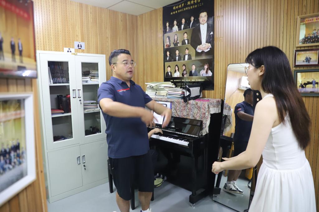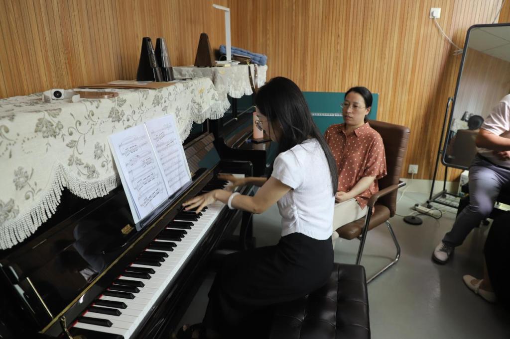 声乐课堂上,郭楠楠、张锦锋等声乐教师为学员一对一授课,从发声技巧、气息运用、作品把握等方面渗透式教学,耐心为学员答疑解惑,上课学员表示受益良多;舞蹈课上,颜帅老师着重强调了基本功的练习,带领学员们体会舞蹈基本功的重要性并积极探讨流行剧目的艺术表现;钢琴课上,姚晓泉、员苗苗等资深钢琴教师,带领学员们感受演奏的呼吸感并示范和指导演奏技巧;闫怡君、范红玲等老师为学员们分享乐器演奏技法以及对曲目的分析理解,为学员们的专业练习指明方向。
