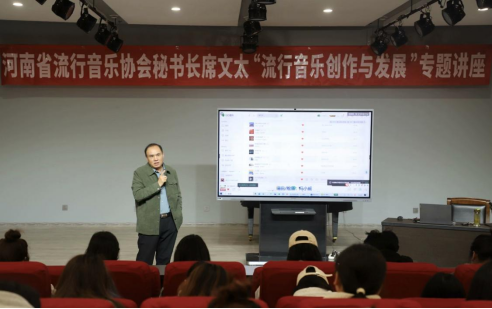 2024年11月7日,河南省流行音乐协会秘书长席文太受公司邀请在tyc122ccVIP艺术楼八音讲堂进行了关于“流行音乐创作与发展”的专题讲座。此次讲座旨在探讨流行音乐的创作理念及流行音乐相关文化产业的发展。公司副经理任远、艺术实践中心主任赵要钦、声乐教研室主任郭楠楠共同出席了本次讲座。现场热爱流行音乐的师生与席文太秘书长进行了广泛的交流互动。