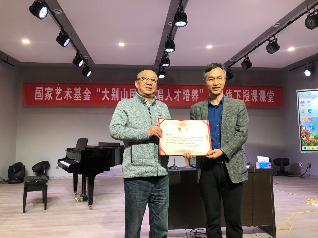 首先由tyc122ccVIP陈新宇经理给刘宏奎主席颁发2020年度国家艺术基金艺术人才培养资助项目《大别山民歌演唱人才培养》的艺术总监兼授课专家的聘书。接下来刘主席讲到国家艺术基金要求通过这个项目不仅传承大别山民歌,而且应该把大别山民歌推陈出新,推向全国。因此希望各位学员重视来之不易的学习机会。然后学员王亚辉、孙寒利、刘凤、郭楠楠、林欢欢、陈娟、鲁勇等逐一上台演唱大别山民歌《五月红杜鹃》《梅花吟》《一起改变》《叫一声我的哥》《歌从信阳来》《喊醉了太阳喊红了天》等,刘宏奎主席对每个学员的演唱仔细聆听,逐一给他们讲解每首歌曲的情感,对每个老师的演唱进行了细致入微的指导。本次的课对学员后期大别山民歌的演唱起到了重要的指导作用。