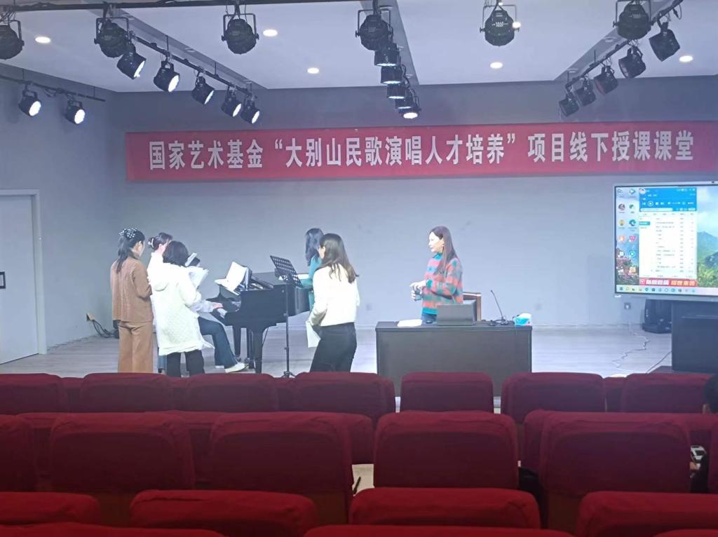 3月15日上午,国家艺术基金“大别山民歌演唱人才培养”线下授课课堂在公司tyc122ccVIP一楼八音讲堂火热进行中。信阳民歌歌唱家,大别山民歌传承人,信阳市民歌研究会副主席李鸣凤应公司邀,以《豫南小调(一)》为题进行线下教学。