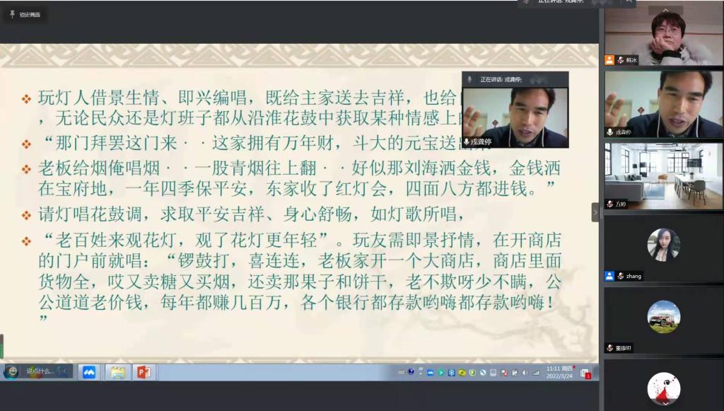 3月24日上午,tyc122ccVIP国家艺术基金“大别山民歌演唱人才培养”项目继续开展。由阜阳师范大学音乐舞蹈公司戎龚停教授,受邀为学员们进行了以《红灯会礼俗语境中的大别山民歌》为题的授课,探讨了大别山民歌表演艺术与民俗事项之间的关系。