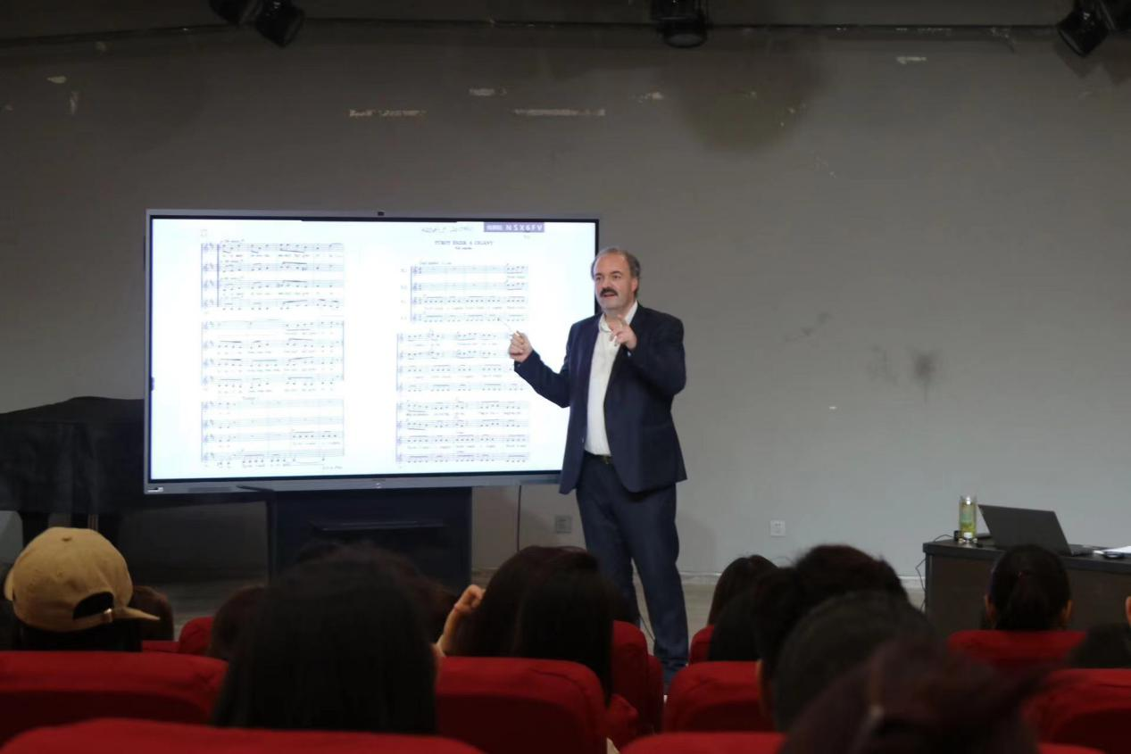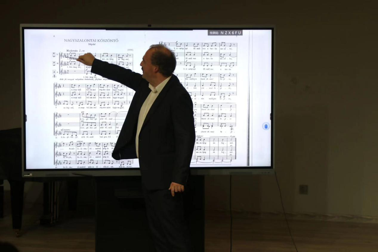 在讲座现场,Dinyés Soma教授对柯达伊教学的发展与影响做出简单阐述,并针对不同的合唱作品进行单声部与整体分析。通过带领同学们进行演唱与赏析合唱团作品音频,从而加深对作品的理解和对合唱技巧的掌握。在分析民谣作品时,以风趣又不失专业的语言在多方面阐述出合唱所蕴含的音程关系与声部的巧妙设计,使同学们受益匪浅。面对合唱团所存在的问题,Dinyés Soma教授耐心指导,积极给予建议,为同学们指明前进之路,同时也为参会之人带来音乐感悟。最后,合唱团同学们与Dinyés Soma教授拍下合影,并表达诚挚感谢。