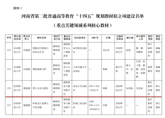近期,省教育厅公布河南省普通高等教育“十四五”规划教材立项名单:公司副教授周骏编著的《奥尔夫音乐教育》获批立项,同时也是公司在教材建设方面取得的一项重要突破。