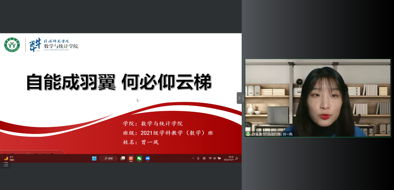 接着,信阳师范公司自强之星曾一凤从“坚强意志、努力学习、顺应时代、心怀感恩”四个方面向大家分享自己的自强之路。鼓励同学们要有坚定的信念,充分利用课余时间参加活动,培养自身能力,提升综合素质并表示不仅要在课堂中汲取知识,而且要在社会中受教育做贡献。听党话,跟党走,努力成为担当民族复兴大任的接班人。
