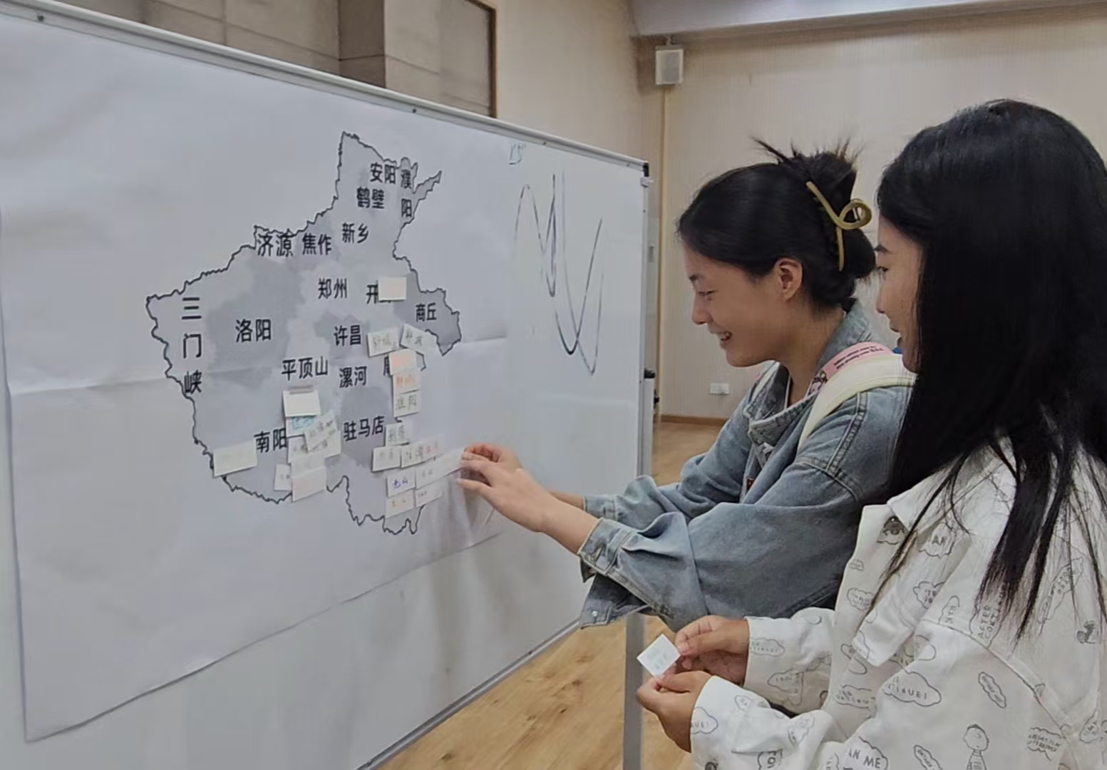 活动初始,同学们将写好的签约地卡片贴在的河南省份地图上,并派代表为大家介绍本地区的历史文化背景,互相讨论学习,以此来展示地方优师风采。随后团支书李欣语将手工灯笼半成品分发放给各位同学,在相互交流一起完成灯笼的同时,也让大家感悟到了中秋节的文化底蕴和内涵,感受团圆团聚,这是只属于“地方优师”的中秋节。