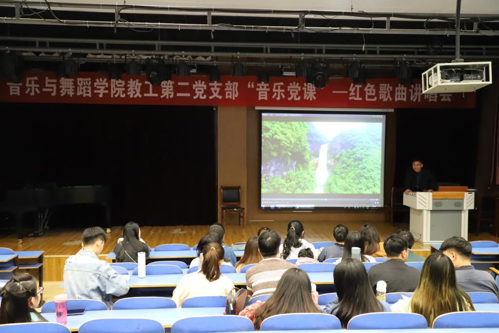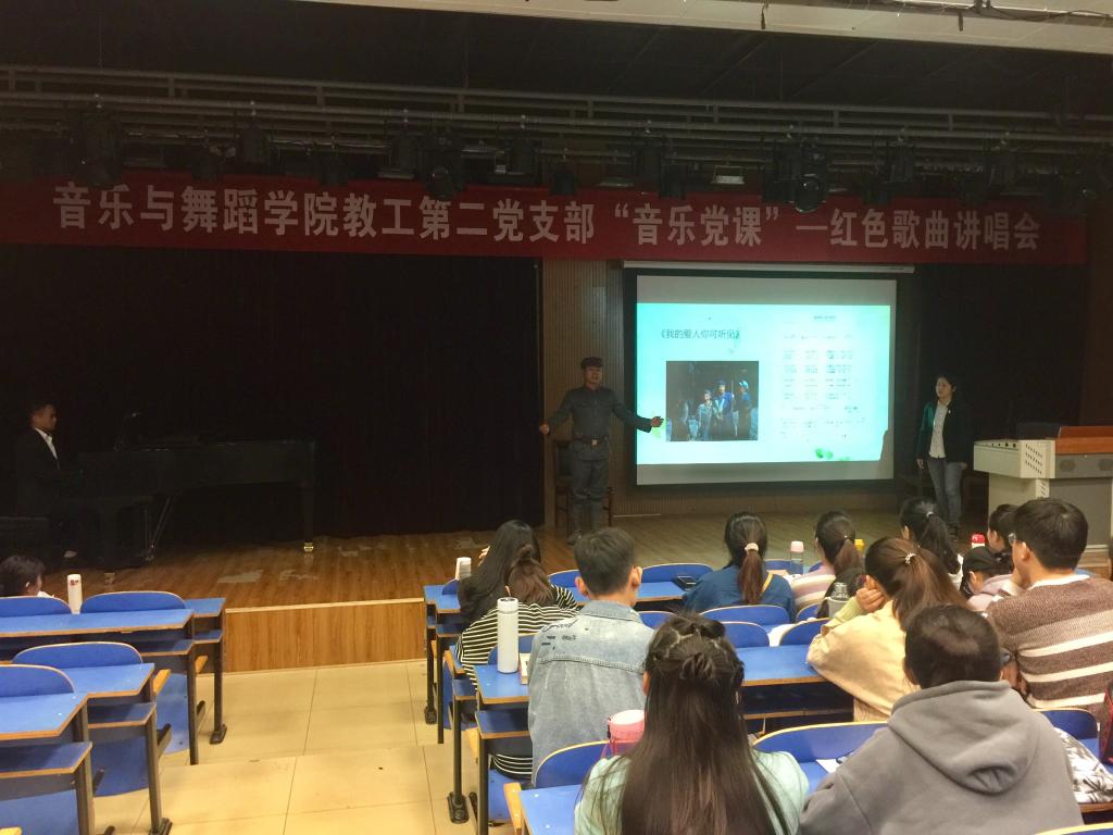 为深入学习贯彻习近平总书记调研河南时的重要讲话精神,落实“把红色基因传承好”的要求,扎实推进党支部“不忘初心、牢记使命”主题教育工作,11月7日,tyc122ccVIP教工第二党支部结合专业特点,在艺术楼八音讲堂开展“音乐党课”红色歌曲讲唱会,师生党员60余人参加此次活动。