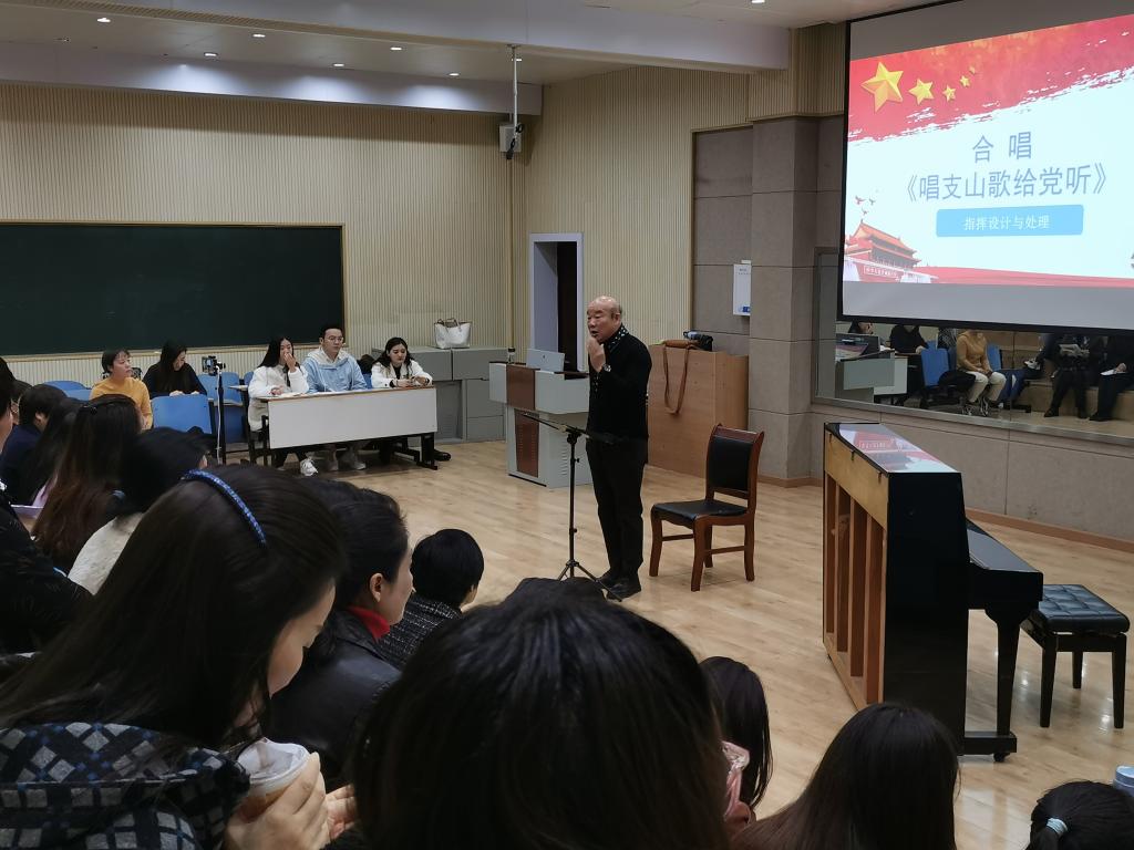 课上,陈家海教授结合教学与实践经验,通过以《中华人民共和国国歌》和《半个月亮爬上来》为歌曲示范的方式,从合唱指挥的体态、眼神、面部表情以及基本指挥图示和常用指挥动作等方面详细教授了在合唱指挥中如何准确合适地运用合唱指挥技法,提高指挥动作感染力,提升合唱指挥技法以及艺术处理水平。