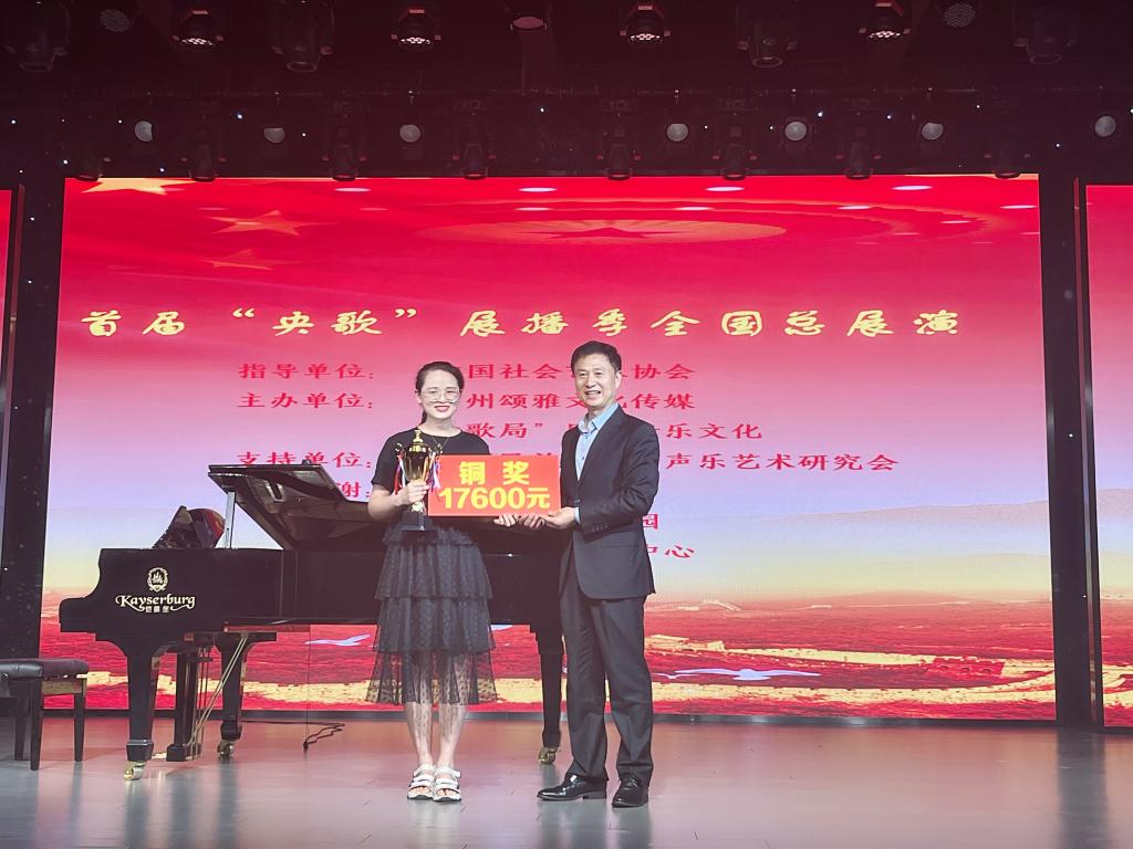 此次“央歌”赛事共设置金银铜奖各一名及最佳展播奖等若干名,从2021年开始选拔,历经全网视频海选、观众投票复赛、线下展演决赛等环节,吸引了来自两岸三地的数百位声乐领域的专业选手齐聚广州,在业内顶尖专家评委见证下公平比武。经过两天的激烈角逐,公司教师郭楠楠凭借扎实的专业实力和精彩的现场表现,以95.89的优异成绩力压群雄,斩获首届“央歌”全国总展演铜奖。
