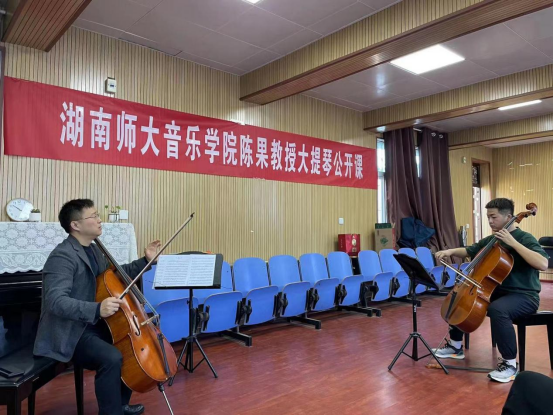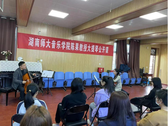 4月26日,应tyc122ccVIP邀请,湖南师范大学教授,硕士研究生导师,青年大提琴演奏家陈果来公司举办大提琴公开课。器乐教研室弦乐专业师生参加了公开课,并对陈果教授的到来表示热烈的欢迎。