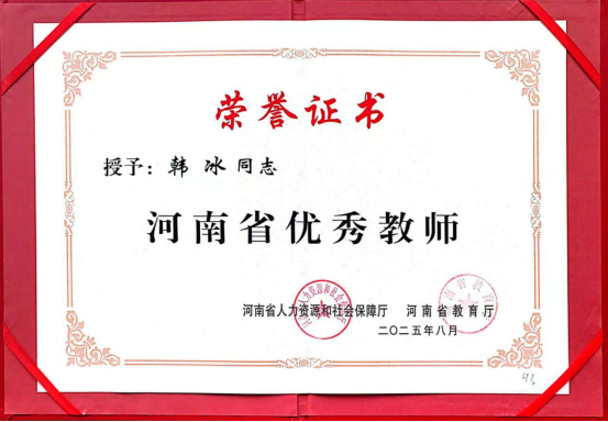 近日,河南省人力资源和社会保障厅、河南省教育厅公布了2025年度“河南省优秀教师”评选结果,公司韩冰教授荣获该荣誉称号。这一荣誉是对韩冰教授个人师德师风、教学水平和科研成就的高度认可。