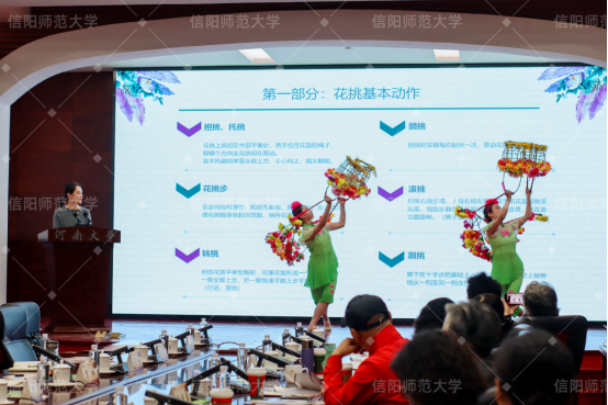 课程汇报由冯燕副教授主讲,以《信阳三花舞》为题,从历史渊源、形态构成、文化价值与教学实践四个方面进行系统展示,对“花挑舞、花伞舞、花鼓灯、火淋子”等信阳地域舞蹈的文化特征与体系结构进行了梳理,呈现了三花舞在淮河流域的传承脉络及其非物质文化遗产保护实况。与会专家学者对公司在地方舞蹈文化研究领域的持续积淀和“三花舞”研究成果给予高度评价,认为公司团队在传统舞蹈“文化研究—动作整理—课堂教学—舞台创编”全链条建设方面具有显著优势,为中原地域舞蹈文化的传承与创新提供了重要经验与范例。